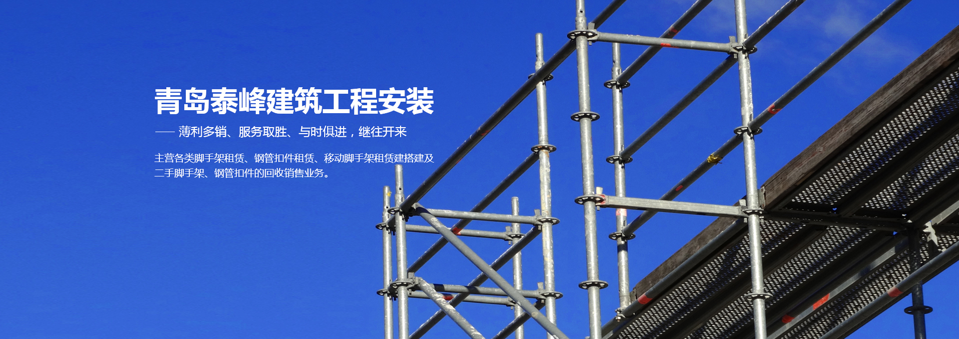 青島泰峰建筑工程安裝有限公司主營各類腳手架租賃、鋼管扣件租賃、移動腳手架租賃建搭建及二手腳手架、鋼管扣件的回收銷售業(yè)務(wù)。公司實力雄厚,擁有鋼管約3000噸、扣件70萬只、鋼笆7萬多片塔吊、人貨電梯多臺;總資產(chǎn)達到1000多萬元。是一家具有腳手架搭建、水電安裝專業(yè)承包施工資質(zhì)的企業(yè),并成為青島市五金協(xié)會的會員單位。且多次參與高層建筑、建筑裝修、玻璃幕墻、橋梁、隧道、地鐵、電廠維修施工、造船等行業(yè)的施工,并獲得施工單位的一致好評。 人無信不立,有信則強公司以“薄利多銷、服務(wù)取勝”為經(jīng)營宗旨...